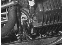 2. На моделях двигателей 2.1 литра отсоедините шланги охлаждающей жидкости (фото слева) и вентиляции (фото справа) от крышки воздушного фильтра. 3. На моделях двигателей 1.9 литра снимите трос акселератора с крышки воздушного фильтра.